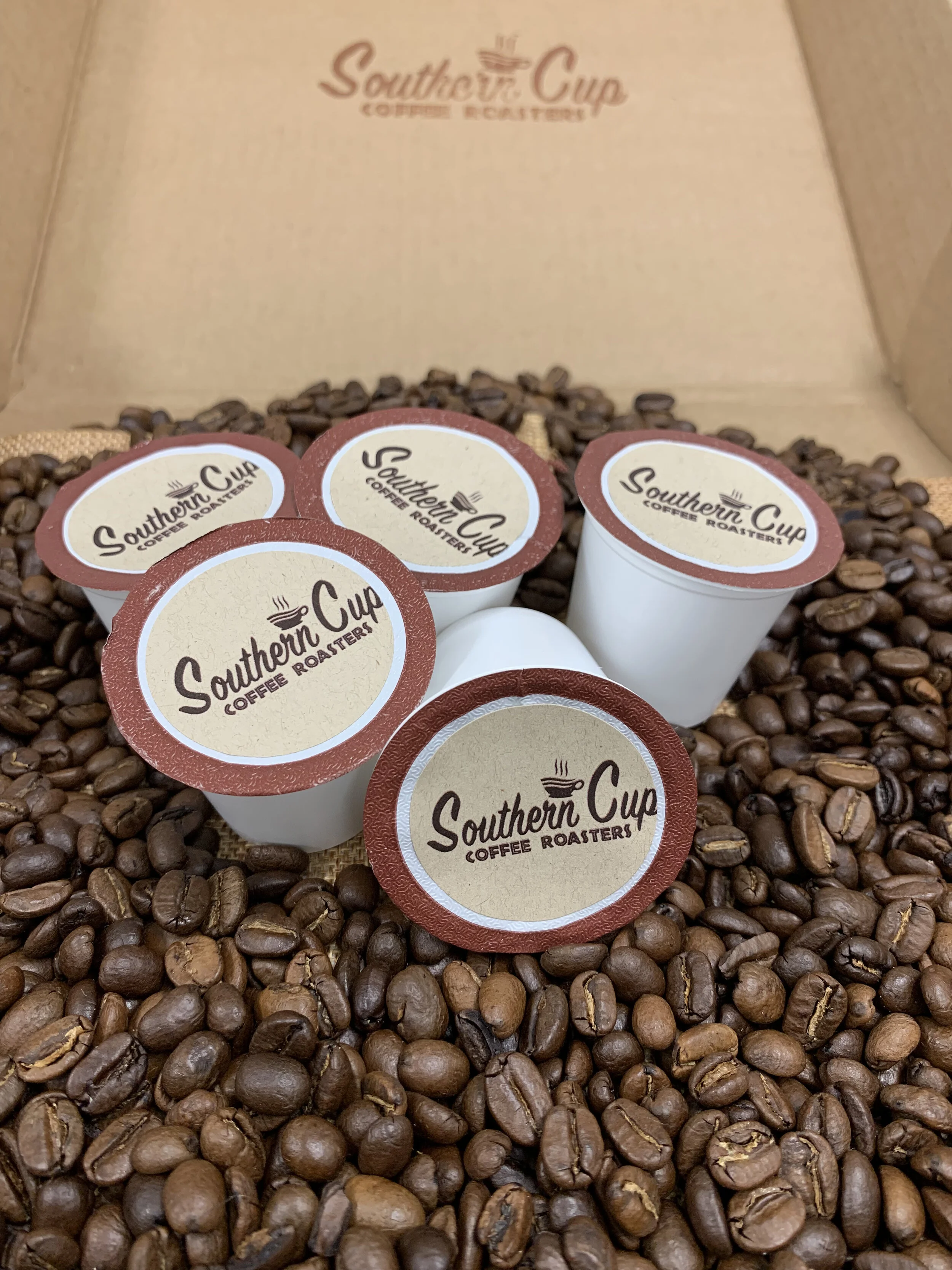 Get your favorite Southern Cup Coffee Roasters flavor as a coffee pod for single serve brewing! For $10, you get a dozen (pack of 12 coffee pods) and for $18 you get two dozen!